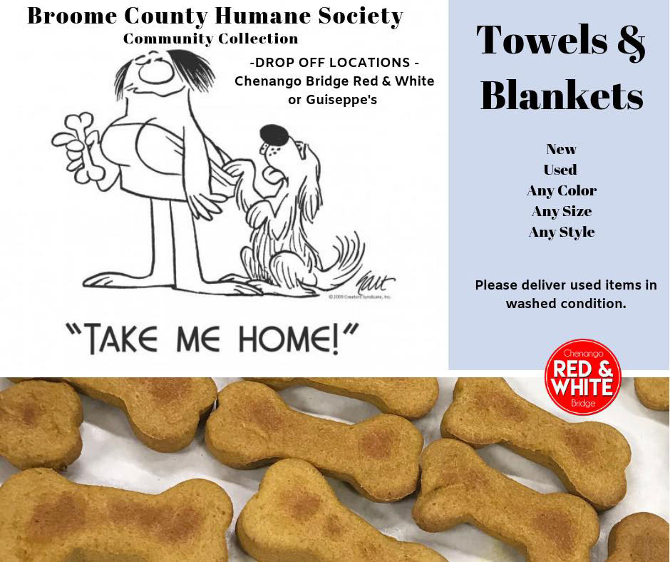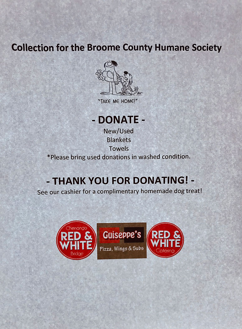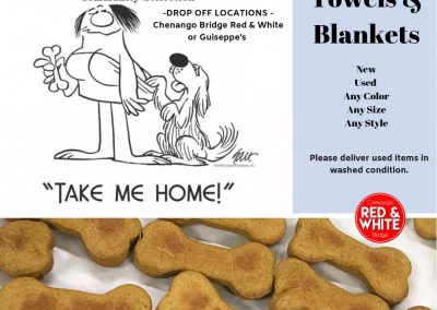 Chenango Bridge R&W + Guiseppe’s collected used/new towels & blankets from community residents, donating a total of 10 large garbage bags to the Broome County Humane Society.