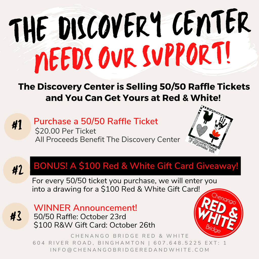 Chenango Bridge Red & White sold raffle tickets on behalf of the Discovery Center and for every ticket sold the purchaser received an entry into our $100 Red & White gift card drawing!